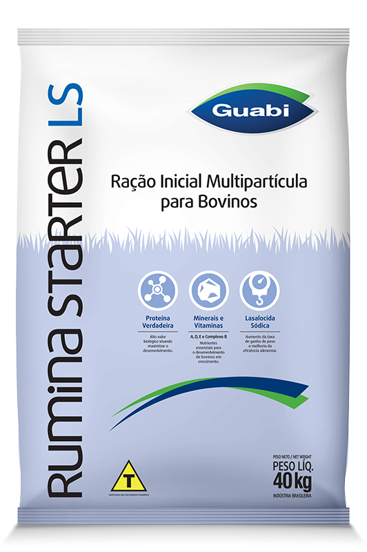 A Guabi oferece rações direcionadas aos primeiros meses de vida do bovino, que devem conter somente proteína verdadeira, alta energia, minerais, vitaminas e aditivos melhoradores de desempenho. Essas rações devem ser fornecidas ao animal a partir do terceiro dia de vida até o sexto mês de idade. Suas fórmulas incluem além das vitaminas A, D3 e E, aquelas do complexo B. Como melhorador de desempenho e de eficiência alimentar os produtos possuem Lasalocida Sódica. A Rumileite LS é uma ração inicial multipartícula, formulada com 20% de PB (proteína bruta) e é indicada para atender as exigências nutricionais de bezerras (os) de alto potencial genético, assim como a Rumina Starter LS (foto acima), que é formada por 18% de PB. Já a Bezerrão LS é uma ração inicial peletizada, que possui 16% de PB, Lasalocida Sódica, minerais e as mesmas vitaminas contidas nas demais rações iniciais.