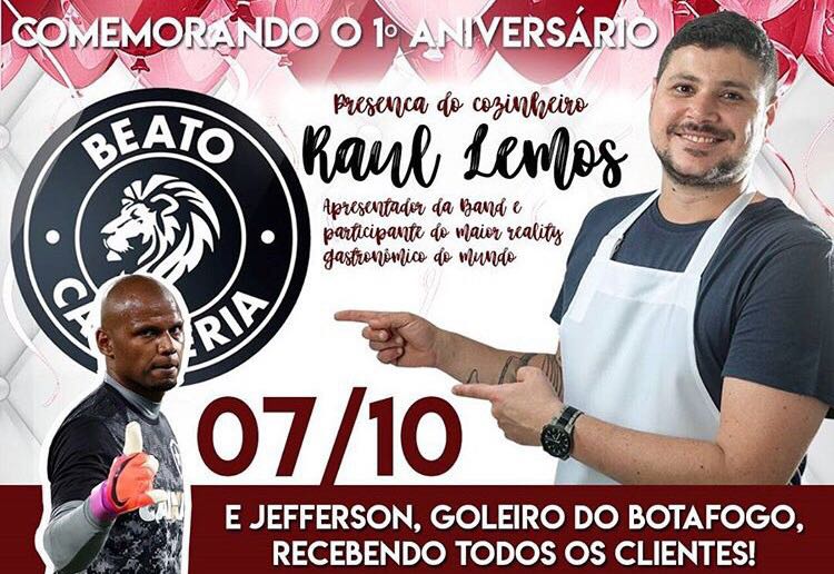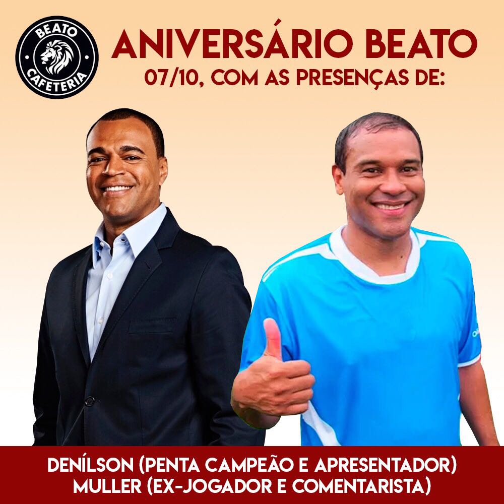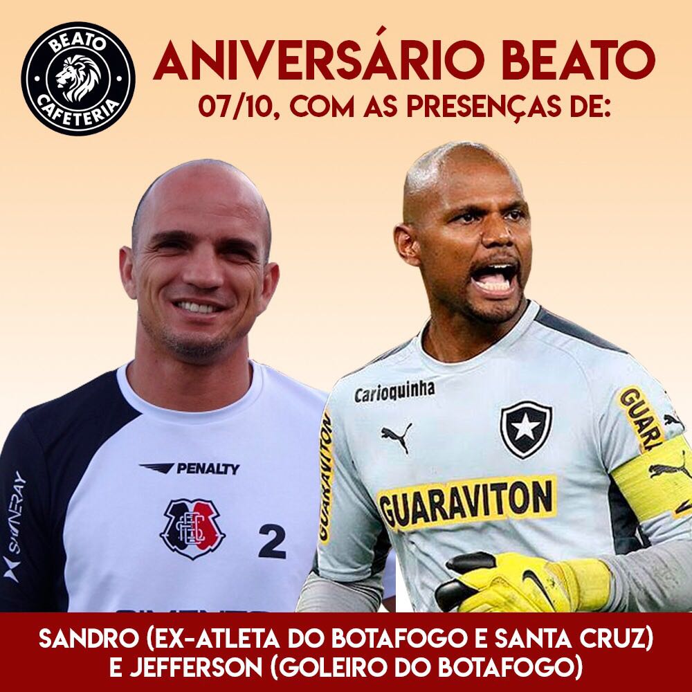A festa de 1 ano da Beato Cafeteria será mais que especial. Ex-jogadores de futebol já confirmaram presença no evento para prestigiar o amigo e goleiro Jefferson do Botafogo. São eles: Denílson (Penta campeão e apresentador), Muller (ex-jogador e comentarista) e Sandro (ex-atleta do Botafogo e Santa Cruz).