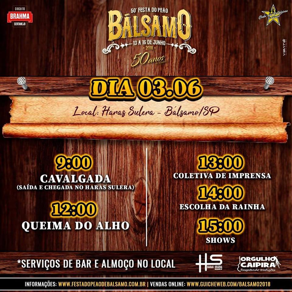 No próximo dia 03 de junho acontece no Haras Sulera, em Bálsamo, o Lançamento Oficial da 50ª Festa do Peão de Bálsamo.